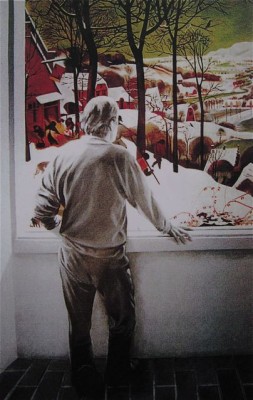 Voici d'abord, les peintres amis. Breughel a ouvert sa fenetre et lui offre a l'infini, au-dela de l'enseigne de Saint Hubert qui grince, de la corneille et des chasseurs, la chaumiere lointaine au feu de cheminée.